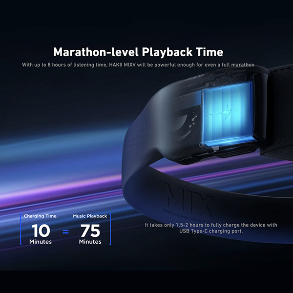 MODEL: MAT-HAKMIXV-BLKOpen-ear | Sweatproof | Bluetooth | Breathable, sweat-wicking fabric and adjustable strap | 8-hour playtime battery life | Powerful 22mm bass | Enhanced voice quality for calls | Fast charging type-C port