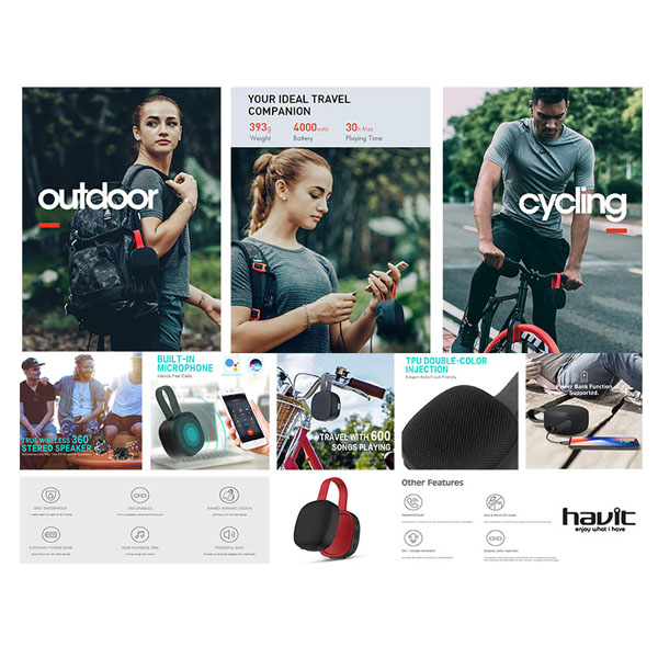 MODEL: Havit-SPE5BRThe Havit-SPE5BR lets you bring your music anywhere you go. With a ingenious magnetic suction design, the strap can be fixed to your backpack, bike or carry on. Also features a IPX7 water, dustproof and shockproof structure, this Red Dot Design Award winner is perfect for a gift for everyone.