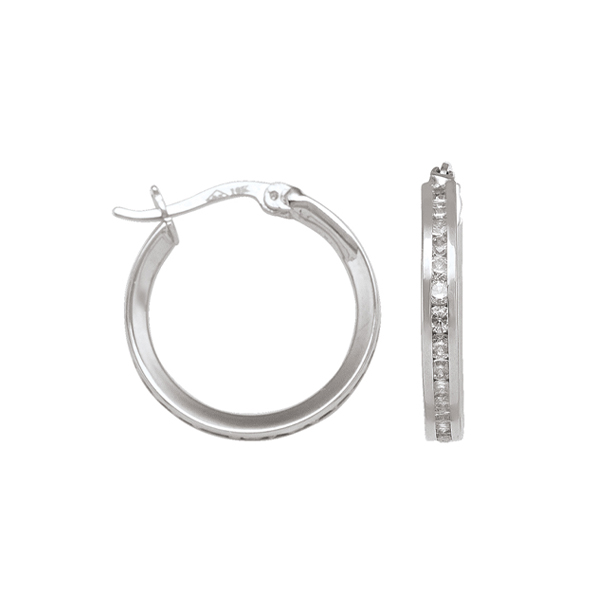 MODEL: ECZE09-10KW10K Silver cubic zirconia hoop earrings. Approximate weight 1.3gm. Made in Italy. Gift box included.