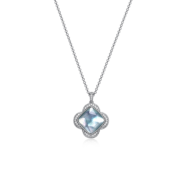 MODEL: NR0Q0CP-WCharles Garnier sterling silver “Bliss” rhodium plated cushion cut 14x5mm genuine white mother of pearl and crystal and synthetic turquoise with cubic zirconia clover necklace. Length 17″ 2″. Gift box included.
