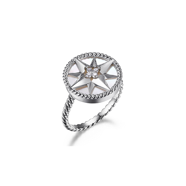 MODEL: RCGR4Q01Y-W-7Charles Garnier sterling silver “STELLA” rhodium plated genuine round white mother of pearl with cubic zirconia ring. Stone size 13.5 and 1.5 mm. Size 7. Gift box included.