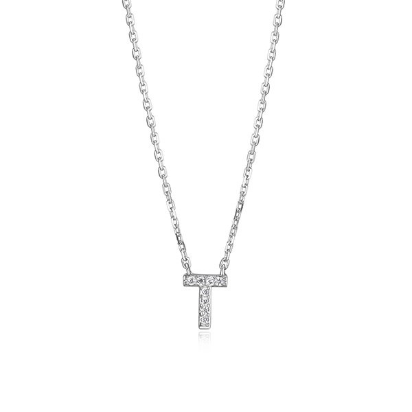 MODEL: BR0A97N-WDiamondlite cubic zirconia mini initial T necklace in sterling silver. 18″ length. Gift box included.
