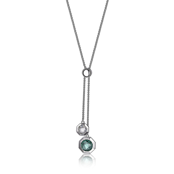 Product name: ELLE Edge Clear Quartz Bolo Necklace Silver Product type: Bolo Necklace Size: 28 inches Stone sizes: 8mm and 6mm Materials: Sterling silver, Genuine Clear Quartz, Created Green Quartz Color: Silver, Green