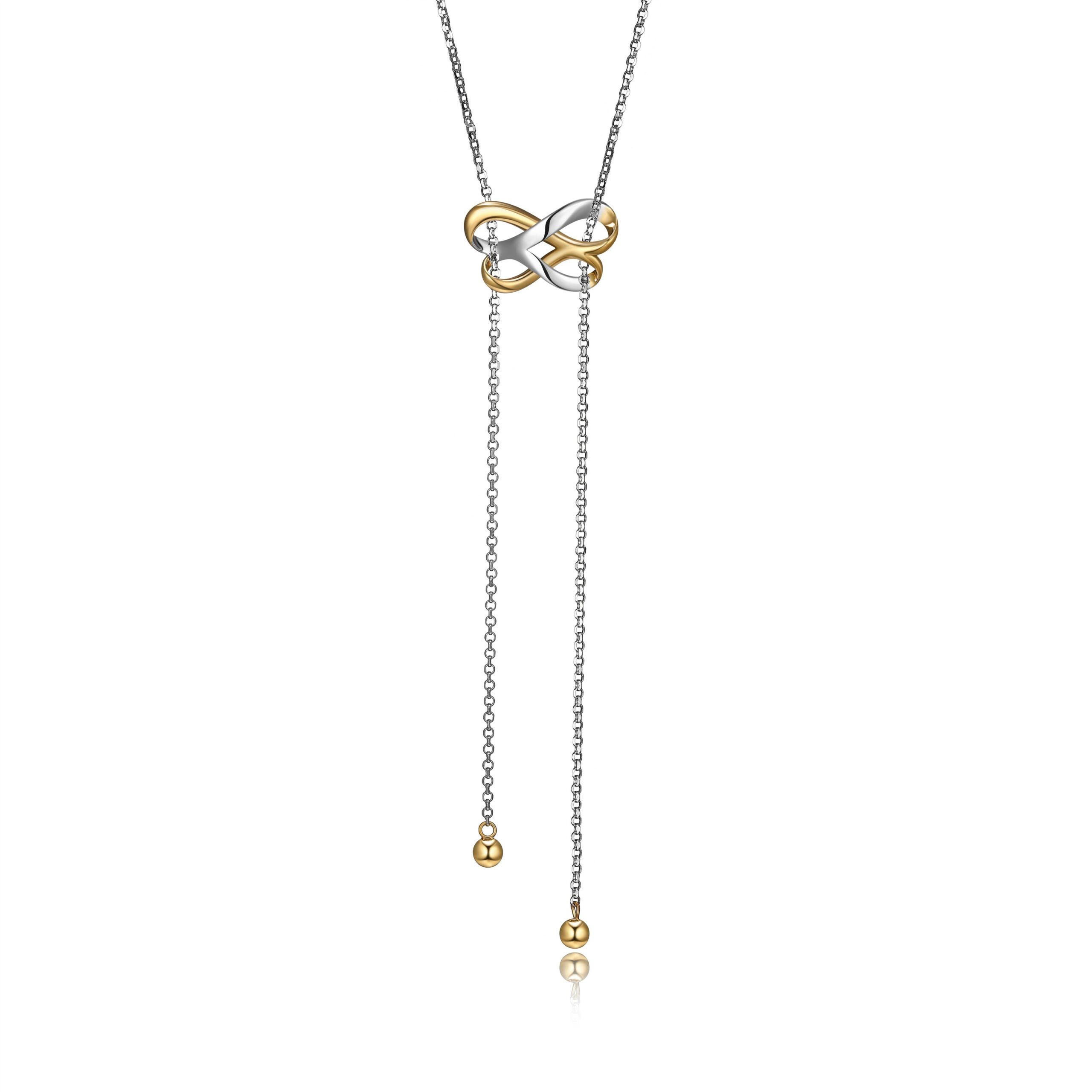 Product name: ELLE Infinite Double Infinity Lariat Two Tone Necklace Product type: Lariat necklace Necklace length: 18 plus 2 inches Infinity size: 20X12 Material: Sterling Silver Color: Silver and Gold