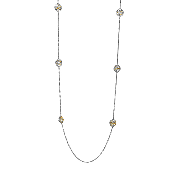 Product Name: ELLE Moon Shadow Three Dimensional Circle Station Necklace Product Type: Necklace Size: 12mm circles, 36 inch length Materials: Sterling Silver, Cubic Zirconia Color: Silver and Gold