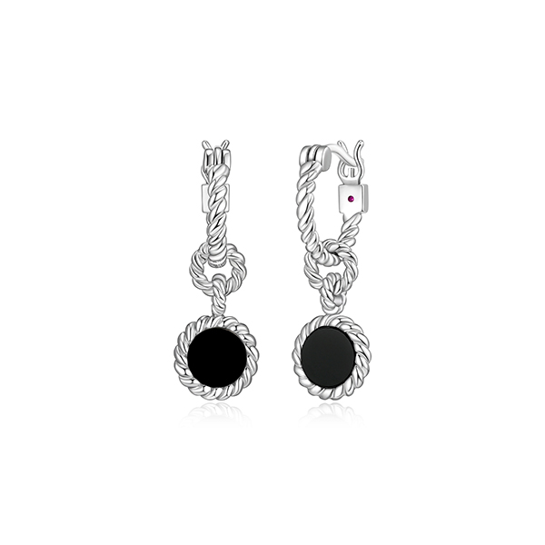 MODEL: ER2LCLH-BELLE “Nautical” rhodium plated sterling silver genuine 6mm round black agate drop with rope trim 13mm hoop earrings. Gift box included.