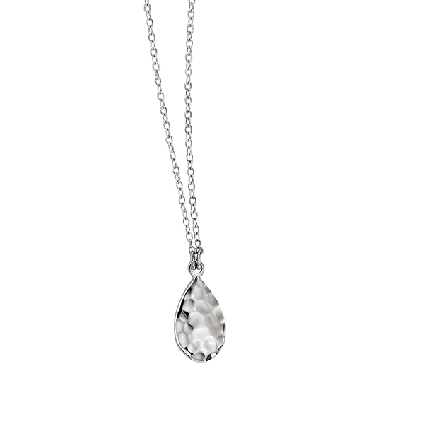 Product name: ELLE Sleek Hammered Teardrop Necklace Product type: Single drop necklace Size: 16 inch necklace with 2 inch extender Material: Sterling Silver Color: Silver