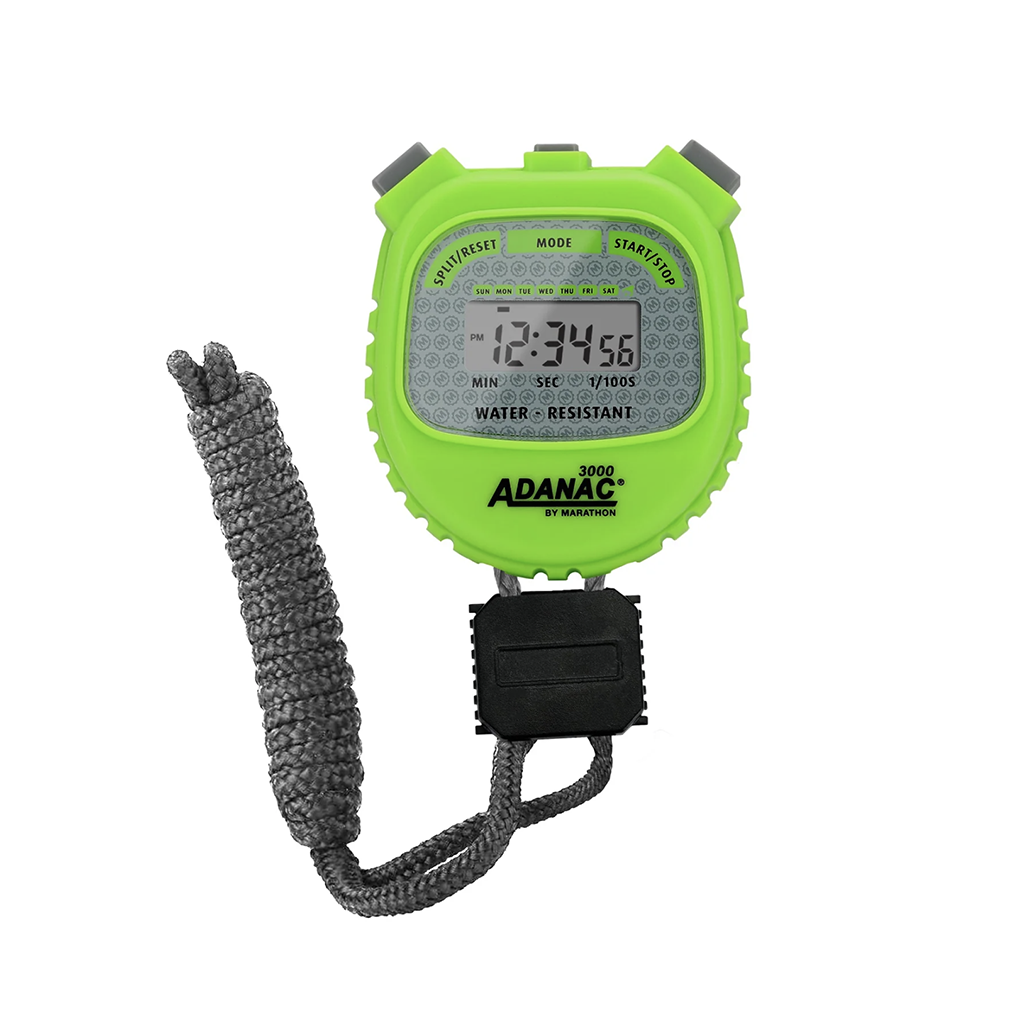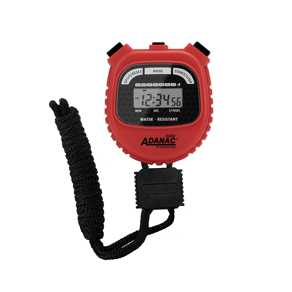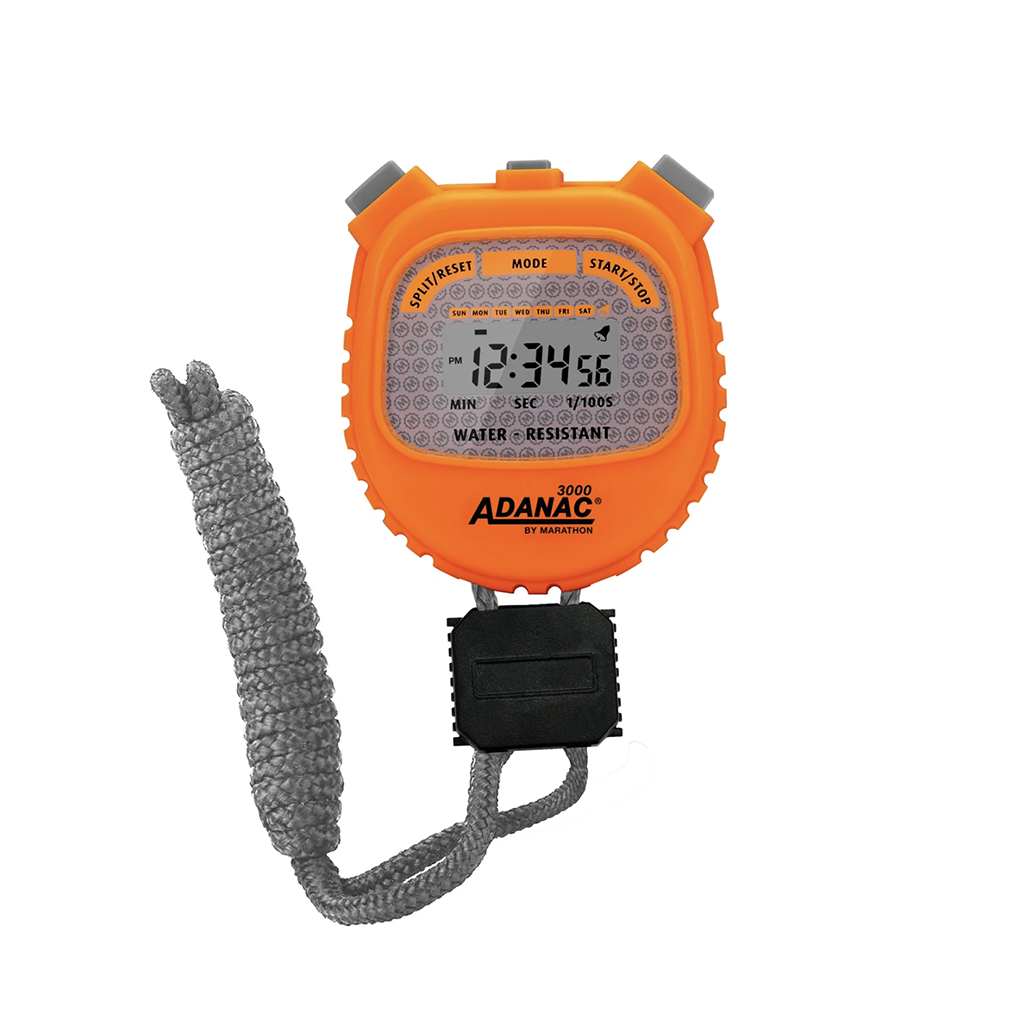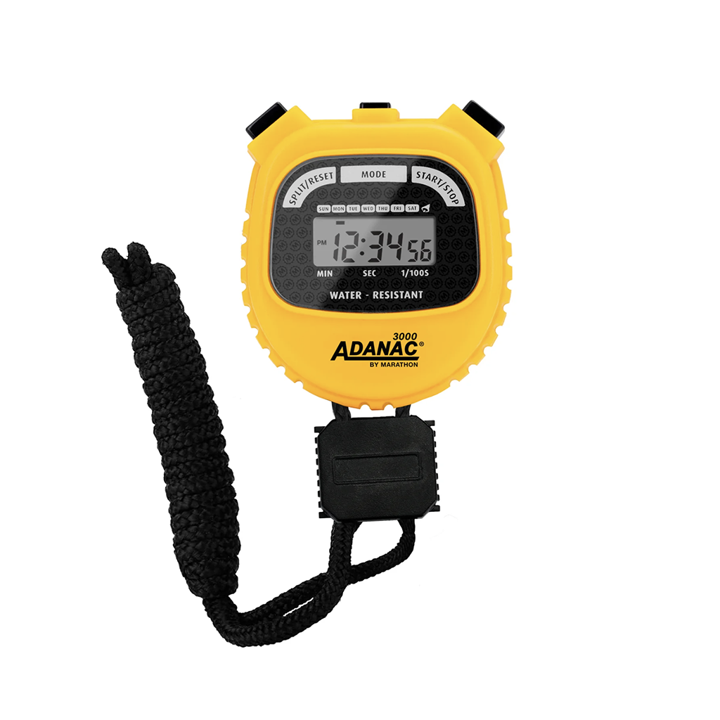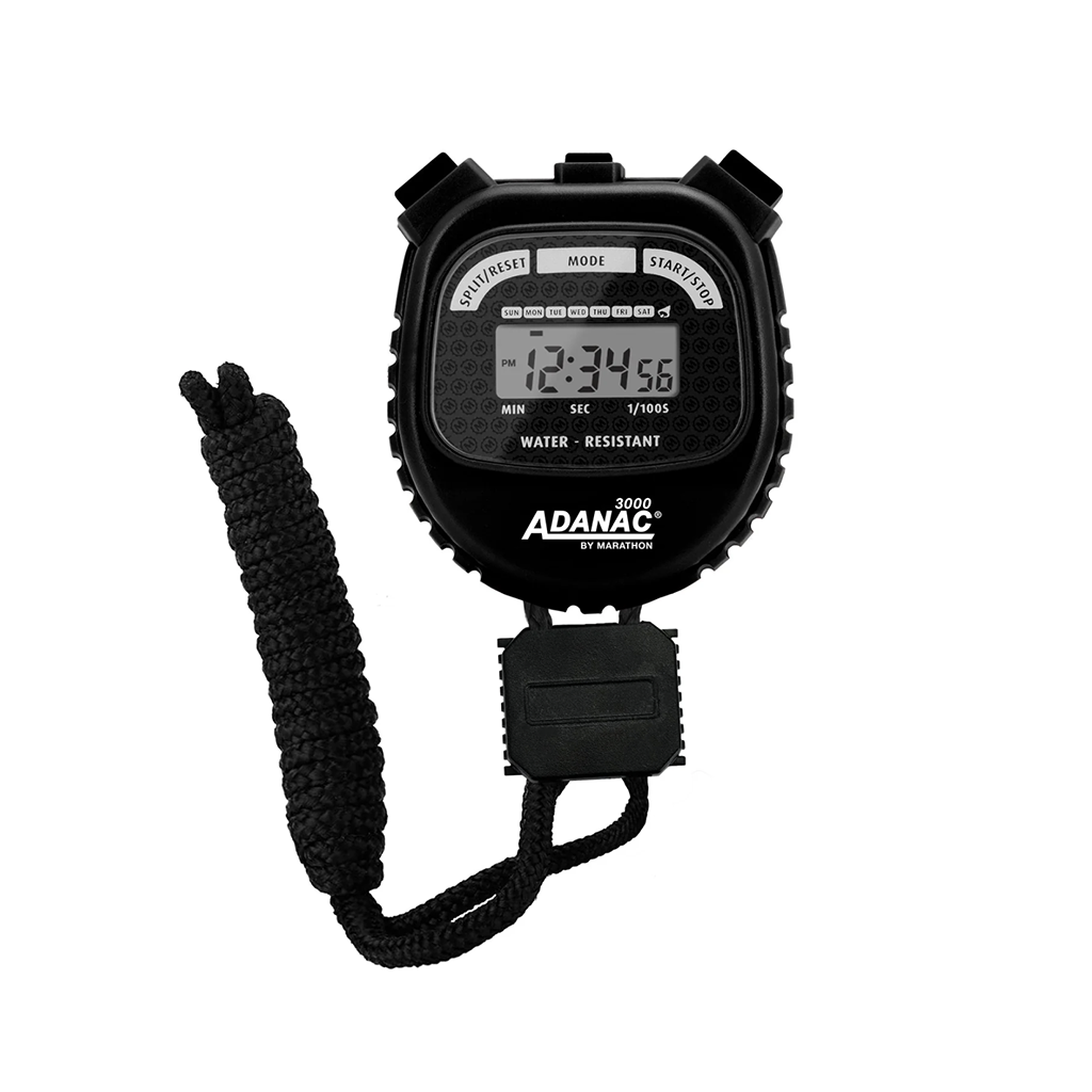 MODEL: ST083000-BKThe Marathon ADANAC 3000 Digital Stopwatch Timer is a commercial-grade stop watch designed for precision and endurance. It displays minutes, seconds, and 1/100th seconds, perfect for single and split events. Water, dust, and shock-resistant for reliable performance. Features time, calendar, and alarm. Split-mode timing with separate start/stop and reset buttons. 1/100 sec resolution for the first 30 minutes, 1 sec thereafter until 24 hours. Comes with a 46″ lanyard for easy handling.