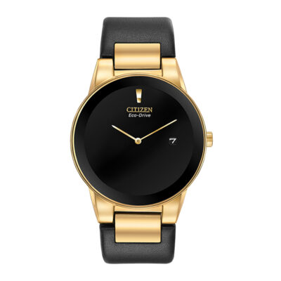 MODEL: AU1062-56ECITIZEN WATCHES Axiom’s refined yet sleek design offers a day-to-night fashion option for the avid trendsetter. Featured in gold-tone stainless steel with a black dial, date, gold-tone stainless steel accents and the intriguing feature of edge-to-edge glass. Case Diameter 40mm. Water Resistance 30M. Fold Over Clasp with Push Button.
