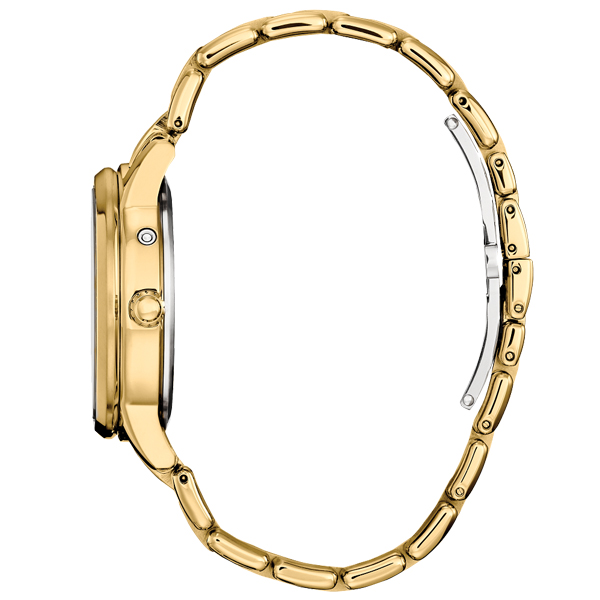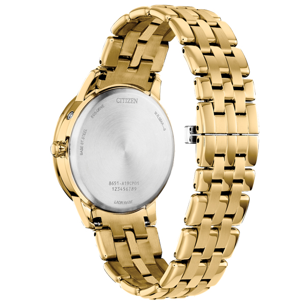 MODEL: FD0002-57DCITIZEN WATCHES Calendrier Eco-Drive ladies watch arrives with elegant charm paired with advanced technology. The gold-tone stainless-steel case holds the analog white mother-of pearl-dial. In addition to the time, it also highlights the month, day and date and keeps track of the phases of the moon. Nine sparkling diamonds are thoughtfully placed on the dial to complete a refined look. The gold-tone stainless-steel bracelet has a deployment clasp for easy access. It is powered by light, any light, using CITIZEN WATCHESs Eco-Drive sustainable technology. Blending sophistication with impressive precision, this watch will take your look up a notch.Case Diameter 37 mm. Water Resistant up to 50 metres.