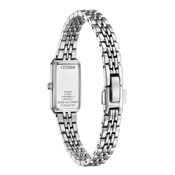 MODEL: EG2691-57DPerfectly complete any look with the elegance of this CITIZEN WATCHES Eco-Drive Ladies’ Classic. Featuring a 30.5 x14.5 mm rectangular stainless-steel case and bracelet, this elegant timepiece fits seamlessly on the wrist. Case Diameter 14.5mm. Water Resistance 300M. Jewellery Clasp with Push Button.