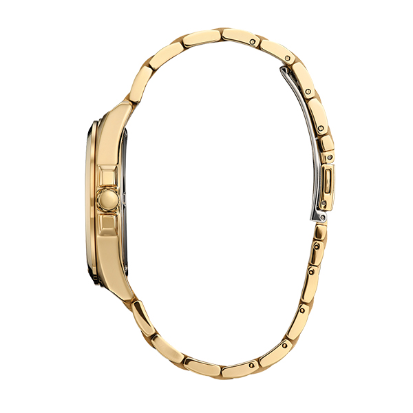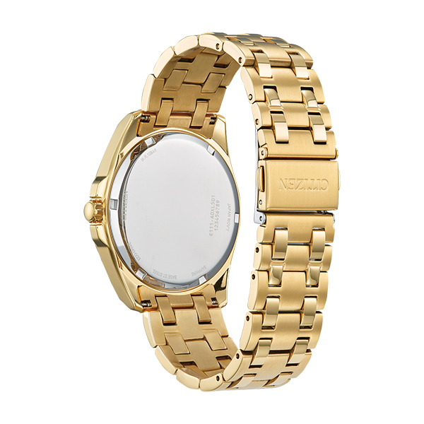 MODEL: BM7532-54PCITIZEN WATCHES Peyten. Make a distinctive style statement. Featuring a gold-tone stainless steel case steel case and a champagne 3-hand dial encased in sapphire crystal, this timepiece is a combination of functional simplicity with a touch of elegance. The gold-tone stainless-steel bracelet has a fold over clasp with push buttons, giving the timepiece an understated refinement. Case size: 41mm. WR 100. Fold Over Clasp with Push Button.