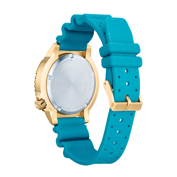 MODEL: BN0162-02XCITIZEN WATCHES PROMASTER. Explore the deepest depths with the latest Promaster Dive in a stylish new colour. This must-have diving watch vibrantly features a gold-tone stainless steel case, a turquoise 3-hand dial with date function, and luminous hands and markers. The durable, matching turquoise polyurethane strap with buckle closure completes the look for a comfortable fit. Featuring our sustainable Eco-Drive technology powered by any light that never needs a battery, youll wear this high-performance timepiece in high style from adventures on land to the deep blue sea. ISO compliant and water resistant to 200 metres. Calibre E168. Case Diameter 44mm. Buckle.