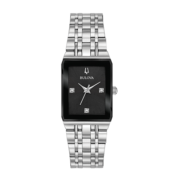 MODEL: 96P202Introducing a new tank style. Silver-tone stainless steel case with edge-to-edge black faceted metalizing mineral crystal. Black dial with three diamonds set on dial. Water resistance to 30 metres.