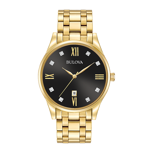MODEL: 97D108From the Diamonds Collection. New 8-diamond black dial, gold-tone stainless steel case and bracelet with double-press deployant closure, three-hand calendar, flat mineral glass, and water resistance to 30 metres.