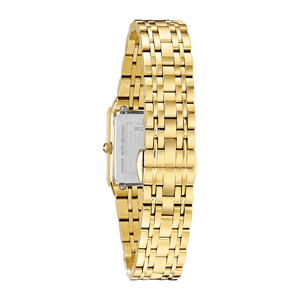 MODEL: 97P140Introducing a new tank style. Gold tone stainless steel case with edge to edge faceted metalizing mineral crystal and gold tone crown. Champagne dial with three diamonds set on dial.