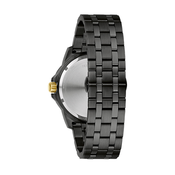 MODEL: 98D176From the Marine Star Collection, this bold timepiece makes a striking style statement. The sport luxury design in black ion-plated stainless steel features a black sunray dial with eight individually hand set diamonds and gold-tone accents, a case with a gold-tone outer top ring, luminous hands, and a calendar. This distinctive men’s timepiece also has a deployant clasp closure and is water resistant to 100 metres. If you’re looking for a watch to stand out from the crowd, look no further.