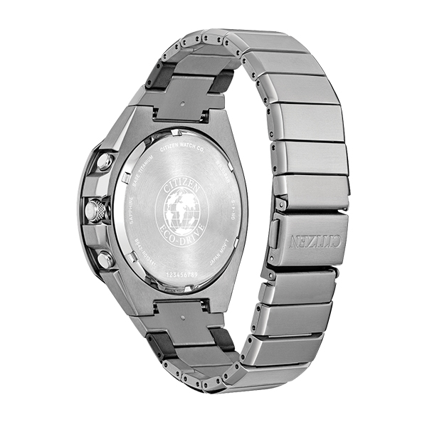 Band Material: Titanium 1 DLC Plated Link Band Type: Bracelet Clasp Type: Fold Over Clasp with Push Button Crystal Material: Sapphire Crystal Product Type: Eco-Drive Case Material: Super Titanium Case Width: 44mm Base Movement Function: 1/5 Second Chronograph Measures up to 60 Minutes, Date