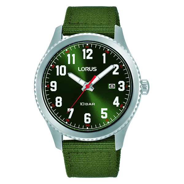 MODEL: RH997RLorus men sport watch using quartz, features including a 41mm stainless steel case and nylon strap, date window, lumbrite display and 100M water resistance.