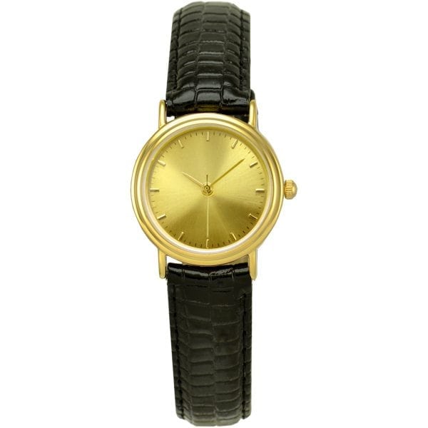 * Matching style his & her dress watches * 1 micro 18K gold plated case * Genuine leather strap * Japanese quartz Movement * Engrave-able stainless steel case back * Water resistant construction * Gift box included * Matching: 150-00GD Case material / Color: Metal / Gold Band material / Color: Leather strap / Black Dial color: Gold dial with black index Hands: 3 hands Case size: 26.5mm diameter Net Weight: 17gm Water Resistance: 10M Warranty: 3 years