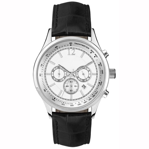* Men's tachymeter chronograph watch * His and her matching styles available * stainless steel case * genuine leather strap * inner tachymeter rim * Luminous sweeping hands and index * Japanese quartz chronograph Movement with date * Water resistant to 50 meters / 165 ft.. * Movement: Japanese quartz chronograph Movement with date * water resistant: 50 meters / 165 ft. * warranty: 5 Years * unit size: 42.5 mm diameter * unit weight: * case material: stainless steel * case color: Silver * band material: leather * Band color: Black