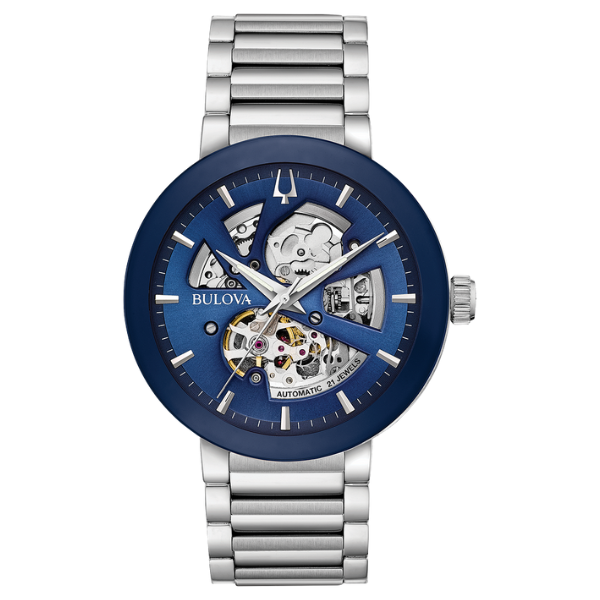 MODEL: 96A204From the Modern Automatic Collection. In stainless steel, automatic self-winding movement with 40-hour power reserve and open aperture blue dial, domed mineral glass, screw-back case, stainless steel bracelet with double-press deployant closure, and water resistance to 30 metres.