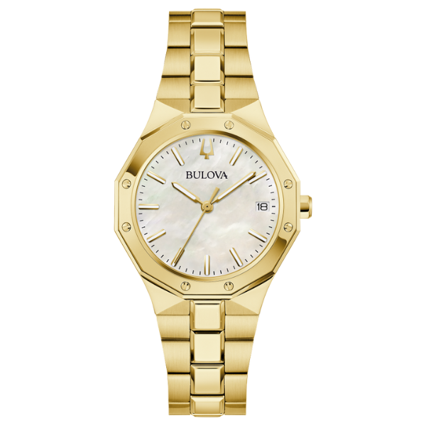 MODEL: 97M119Bold, elevated design characterizes this Classic Bulova Prestige womenÕs timepiece that balances bold design with an elegant presence. The watch features a faceted 32mm gold-tone stainless steel case with a geometric bezel, flat sapphire crystal with anti-reflective coating, 100m of water resistance, and a chamfered 3-link bracelet with brushed and polished finishes and a push-button deployant closure. The lustrous mother-of-pearl dial has gold-tone hands and applied markers with Super-LumiNova luminescent fill and a date display. Striking in both its modernity and its sophistication, this Bulova ladiesÕ watch is an ideal companion on any wrist.
