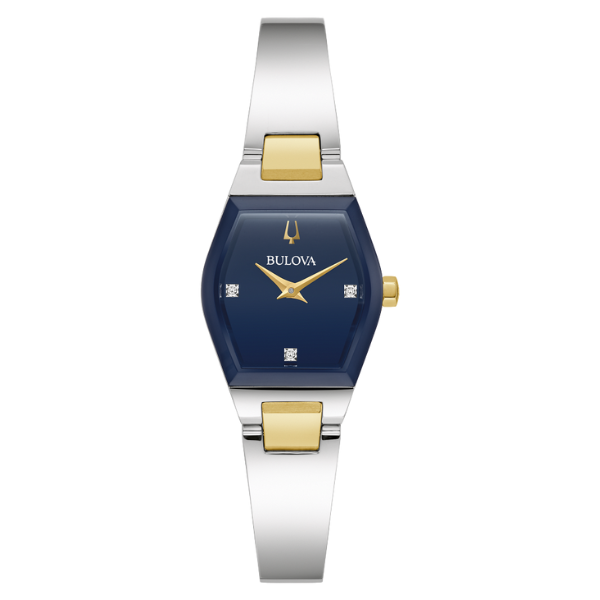 MODEL: 98P218Introducing the Bulova 98P218 Gemini Quartz Diamond Ladies Watch with a captivating blue dial, a timepiece designed to elevate your style effortlessly. This modern and uniquely refined watch features a sleek silver and gold tone case with an edge to edge faceted metalized mineral crystal. The deep blue dial showcases elegant gold tone accents, beveled hands, and three hand set .8mm diamonds, all perfectly complemented by a comfortable bangle style silver and gold tone bracelet secured with a jewellerÕs clasp. Powered by the reliable GL24 quartz calibre, this Bulova Gemini timepiece offers a sophisticated touch to any ensemble.