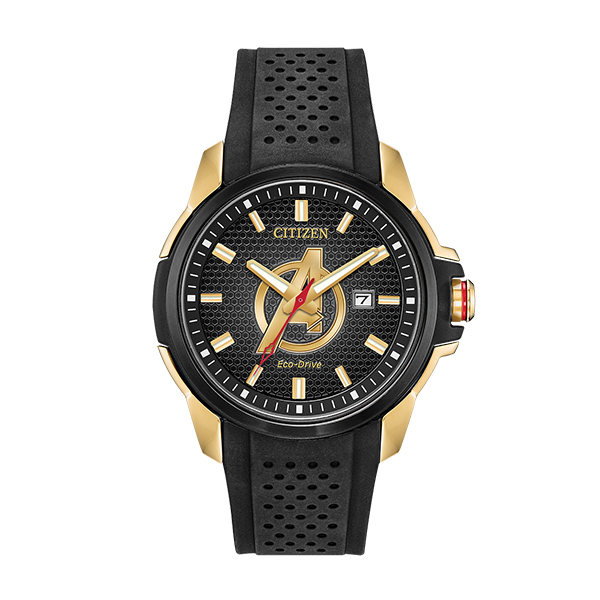 Wear your Super Hero on your wrist with the new Marvel Avengers timepiece by CITIZEN. The iconic Avengers logo showcased on a black patterned dial within a black ion-plated stainless steel case with a gold-tone chroma finish and black silicone strap with date. Featuring our Eco-Drive technology – powered by light, any light. Never needs a battery.