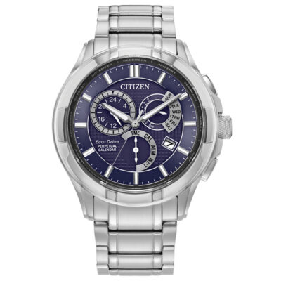 Band Material: Stainless Steel Band Type: Bracelet Clasp Type: Deployment Clasp with Push Button Crystal Material: Sapphire Crystal Product Type: Eco Drive Case Material: Stainless Steel Case Width: 42.5mm Gem Type: Diamond Base Movement Functions: Retrograde Perpetual Calendar, Dual Time (Second Time Zone), 12/24 Hour Time, Alarm, Month/Day/Date