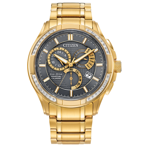 MODEL: BL8172-59HCITIZEN WATCHES CLASSIC. Add sophistication to your look with the Diamond 8700. Styled with a grey dial and gold-tone stainless steel bracelet, this watch offers timeless charm with advanced functions, including a perpetual calendar, alarm, dual time and water resistance to 100 metres. Completed with a gold-tone stainless steel 42mm case and bezel adorned with 32 diamond accents. Sustainably powered by any light with Eco-Drive technology – never needs a battery. Case Diameter 42.5mm. Water Resistance 100M. Deployment Clasp with Push Button.