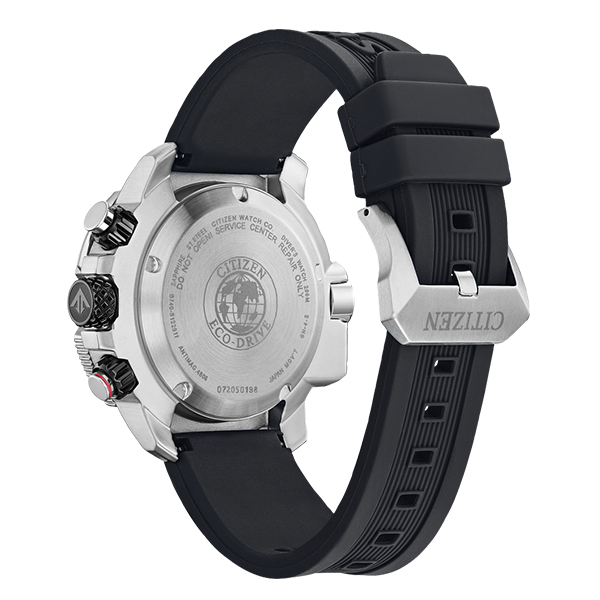 Band Material: Polyurethane Band Type: Strap Clasp Type: Buckle Crystal Material: Sapphire Crystal Product Type: Eco Drive Case Material: Stainless Steel Case Width: 46mm Base Movement Function: 1 Second Chronograph Measures up to 50 Minutes, Depth Display to 50 Meters, Auto Start Dive Mode, Maximum Depth Memory, 12/24 Hour Time, Power Reserve Indicator, Date