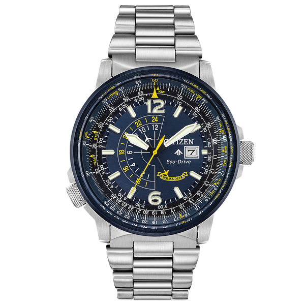 MODEL: BJ7006-56LCITIZEN WATCHES NAVIHAWK. The Blue Angels are the Navy’s elite flight demonstration squadron renowned for their precision and grace showcased in each of their flight maneuvers. This precision and grace is exhibited in the CITIZEN WATCHES Blue Angels Nighthawk seen here with a navy blue ion plated stainless steel case, stainless steel bracelet, and navy blue dial with bright yellow accents. It features 12/14-hour time and a pilots rotating slide ring. Featuring our Eco-Drive technology powered by light, any light. Never needs a battery. Case Diameter 42mm. Water Resistance 200M. Safety Fold Over Clasp with Push Button.