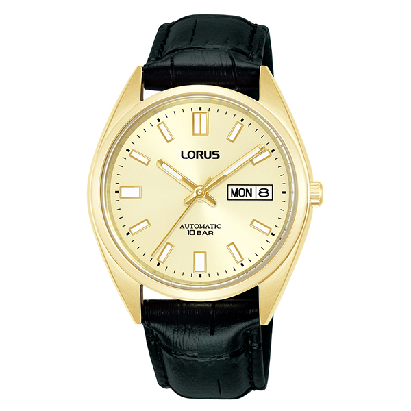 MODEL: RL436CLorus men automatic watch using quartz movement with gold dial. stainless steel case 39 mm with screw case back, with leather strap. Functions with lumbrite display and 100m water resistance.