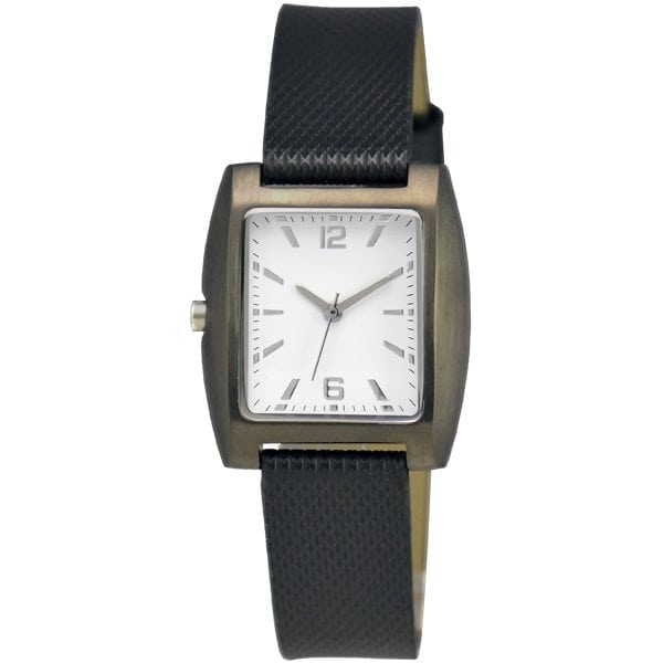 * Special placement of the crown at the 9 o'clock position * Custom molded light metal casing * Flexible rubberized strap * Engrave-able case back * Japanese quartz Movement * Water resistance construction * Gift box included Case material / Color: Metal / Titanium Band material / Color: Rubberized strap / Black Dial color: White dial with silver index Hands: 3 sweeping hands Case size: 29.5mm x 28mm Net Weight: 30gm Water Resistance: 10M Warranty: 3 years