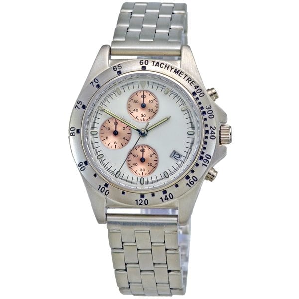 MODEL: 834-02PKDon’t miss out on this sporty brass case Tachymeter unisex watch. The Matsuda Tachymeter features a 37mm brushed silver finish brass case, tachymeter marking on bezel, luminous hands and markers, stainless steel band, Japanese chronograph quartz Movement with date, and water resistance construction.